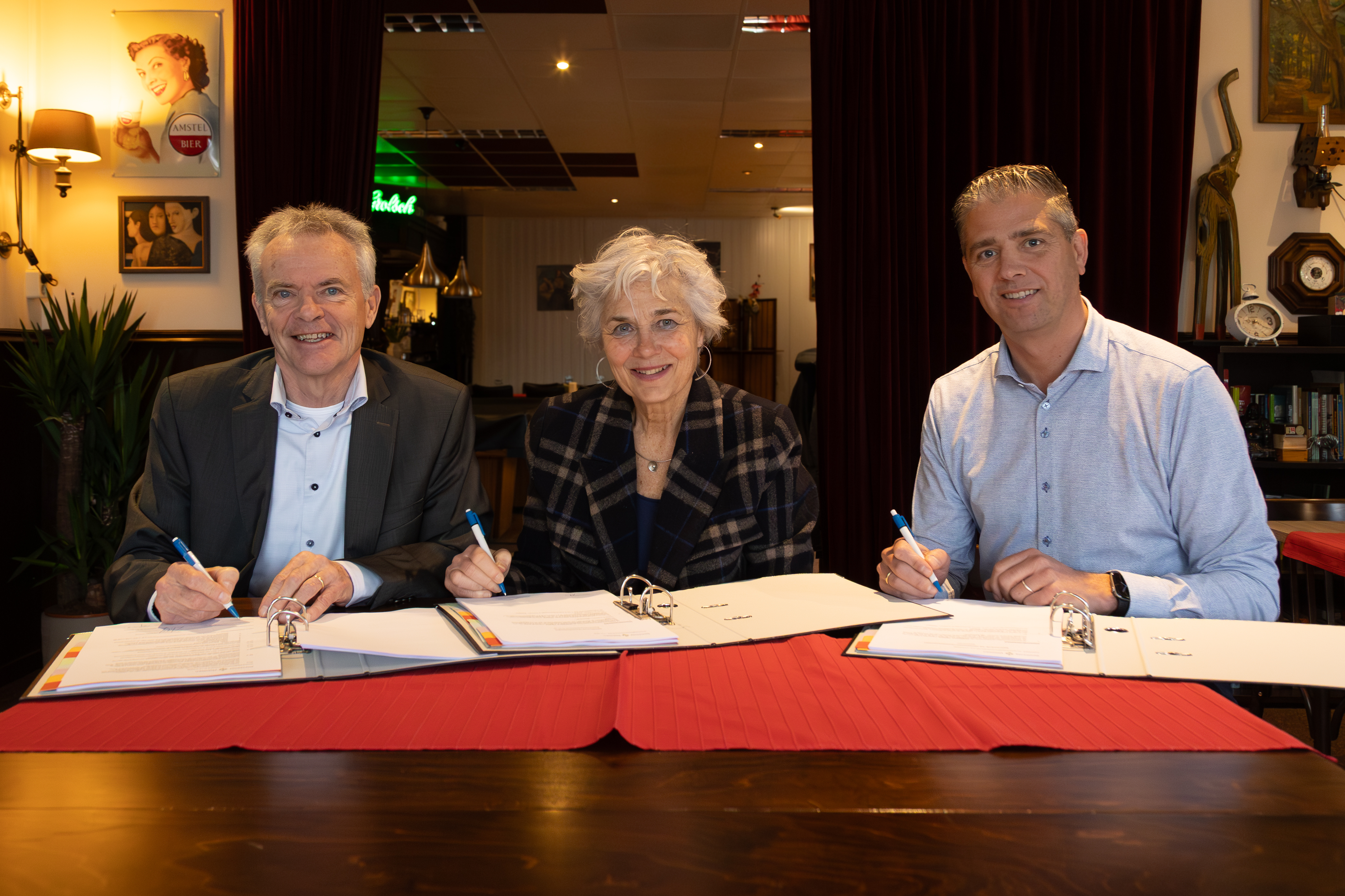 Beeld: Wethouder Leo Bongers (gemeente Ommen), Monique Govers (Vechtdal Wonen) en Cris Zijlmans (Le Clercq Projectontwikkeling) ondertekenen de koop-realisatieovereenkomst voor de woningbouw in Beerzerveld. © Aniek Wessel
